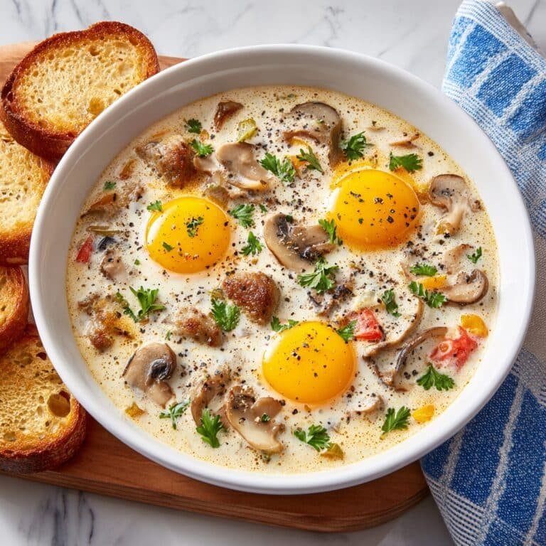 A hearty and comforting Slow Cooker Breakfast Soup featuring breakfast sausage, potatoes, tomatoes, and a creamy Hollandaise sauce base. Topped with scrambled eggs and sautéed mushrooms, this easy-to-make soup is perfect for starting your morning with warmth and flavor.