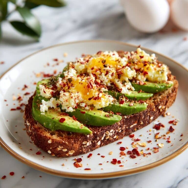 A quick and delicious Grated Egg Avocado Toast with a spicy kick, perfect for a nutritious breakfast or snack. Creamy avocado slices topped with grated hard-boiled egg, drizzled with olive oil and seasoned with chili flakes, salt, and pepper.