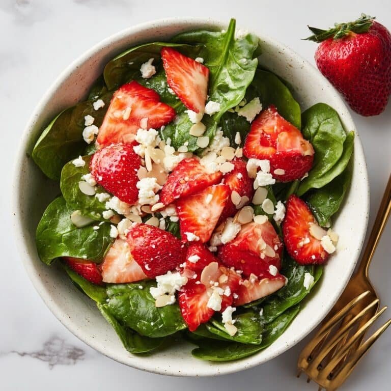 A fresh and delightful Spinach Strawberry Salad featuring crisp spinach, sweet strawberries, toasted almonds, and optional creamy feta cheese, all tossed in a tangy balsamic vinaigrette.