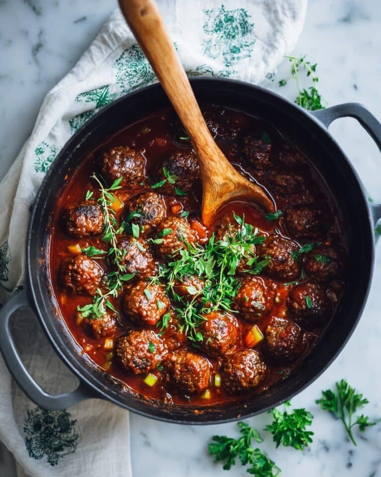 Reheat gently on the stovetop over low heat, stirring occasionally to prevent sticking. If microwaving, cover loosely and add a splash of water or stock to keep moisture. The oven is great too—wrap in foil at 325°F until warmed through. Avoid high heat or quick reheating to keep meatballs tender and gravy luscious.