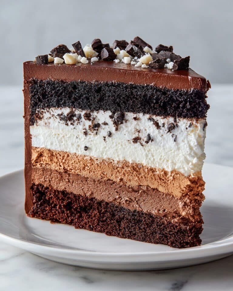 Tuxedo Cake is a decadent triple chocolate mousse cake featuring layers of moist chocolate cake, rich dark and white chocolate mousses, and a smooth milk chocolate ganache. This elegant dessert is perfect for special occasions and chocolate lovers seeking a sophisticated treat.