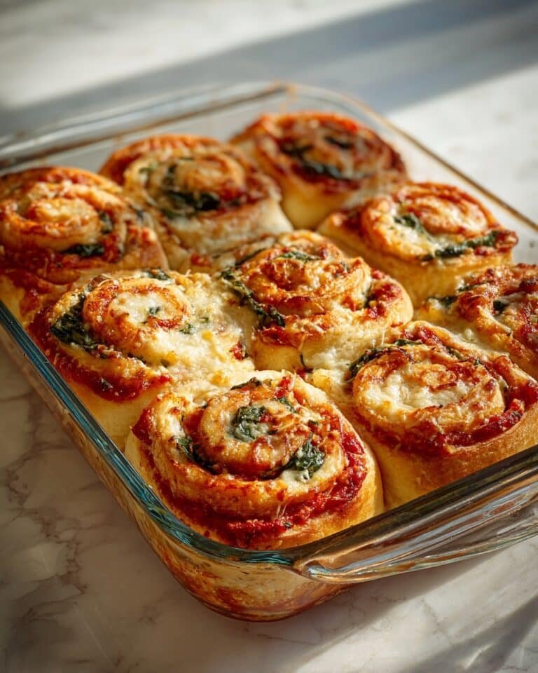 Assemble Rolls: On a floured surface, roll out the dough into a large rectangle. Spread the marinara sauce evenly over the dough, then distribute the cooled spinach and onion filling on top. Starting from the long edge, roll the dough tightly into a log shape.