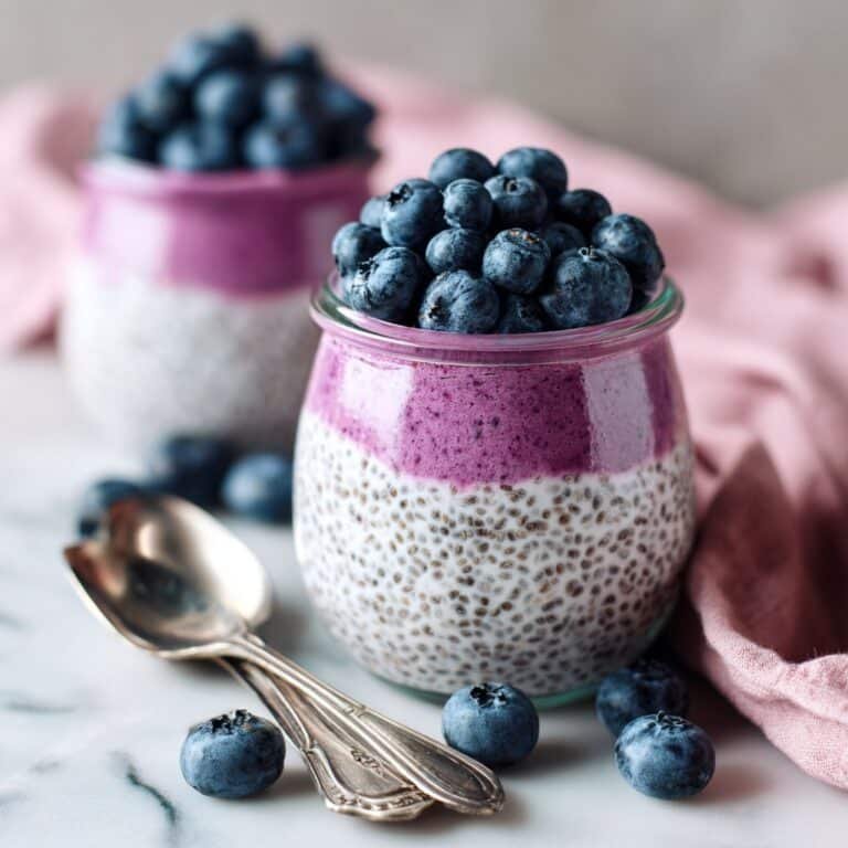 This Vegan Blueberry Chia Pudding is a nutritious and delicious plant-based breakfast or snack option. Made with chia seeds soaked in unsweetened soy milk and sweetened with maple syrup, it’s layered with a creamy blueberry vegan yogurt and topped with fresh blueberries for a refreshing and antioxidant-rich treat.